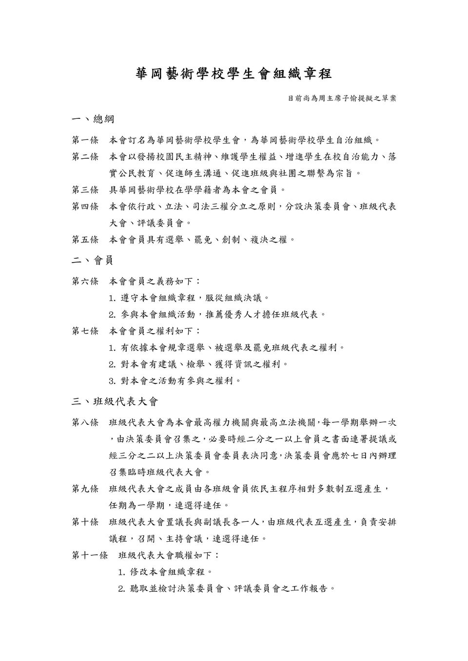 《 華 岡 藝 術 學 校 學 生 會 組 織 章 程 》 草 案